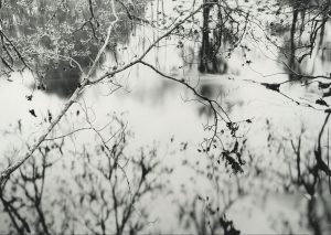 “The capturing of any one image can involve days, weeks and months of preparation, arduous travel and considerable efforts to achieve. The locations are found on a map, tracked down and then photographed, each place the subject of a single negative taken with a weighty antique field camera. They are meditative, almost philosophical images, exquisitely printed by the artist in the 19th century manner with layers of silver and gold chloride. In each place the geography may not be readily identifiable, the image on cusp of dissolving into abstraction.”