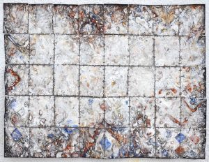 However, Mark creates his quilts from materials more commonly used in the building trade. Cement, filler, wood,wire and metal sheeting are combined with paint and recycled textiles to produce the rich surfaces and intricate textures that make up his finished pieces.
