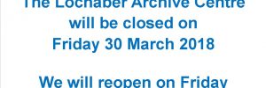 The Lochaber Archive Centre will be closed on Friday 30th March 2018 for the Easter public holiday. We will be open as normal on Friday 6th April at 10am.Read more