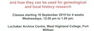 Introduction to Archives and how they can be used for genealogical and local history research Classes starting 16 September 2015 for 4 weeks Wednesdays, 12.00 pm to 1.00 pm. Lochaber Archive Centre, West Highland College, Fort William For information or to book a place, contact the Lochaber Archive Centre, 01397 700946/701942 [email protected]… Read more »Read more