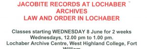 Introduction to Archives: JACOBITE RECORDS AT LOCHABER ARCHIVES LAW AND ORDER IN LOCHABER Classes starting WEDNESDAY 8 June for 2 weeks Wednesdays, 12.00 pm to 1.00 pm. Lochaber Archive Centre, West Highland College, Fort William To book a place, contact Lochaber Leisure Centre Tel: 01397 704359 For information contact Lochaber Archive Centre at 01397 700946/701842… Read more »Read more