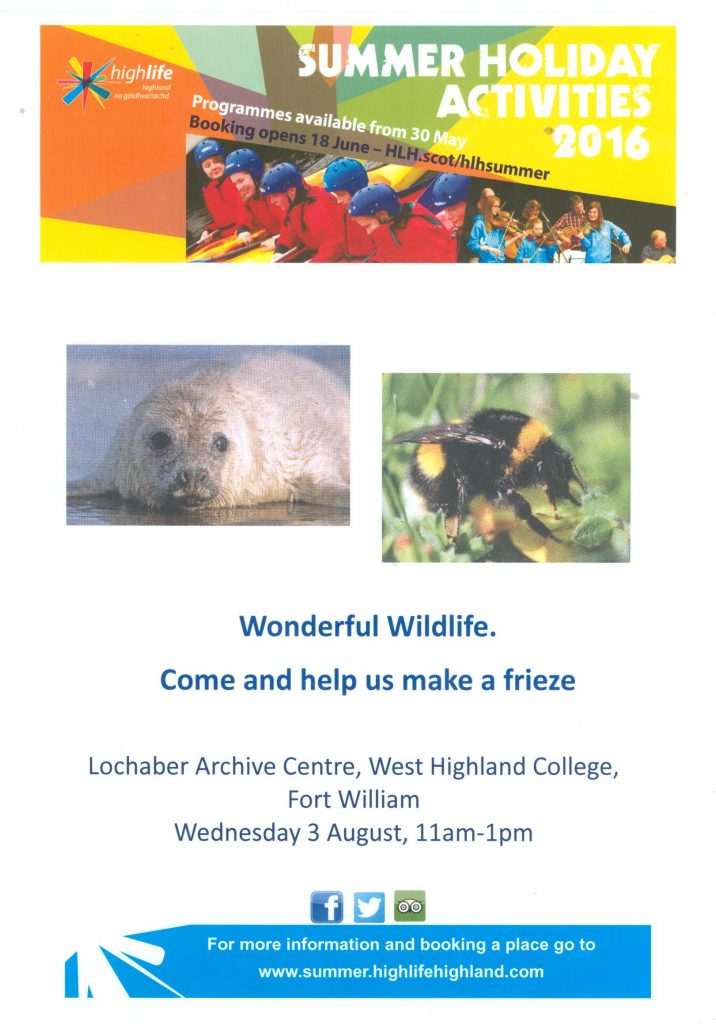 Home » News » SUMMER ACTIVITY FOR THE YOUNG AT LOCHABER ARCHIVE CENTRE, 3 August 2016 WONDERFUL WILDLIFE: MAKE A FRIEZE For more information and to book a place, please see www.summer.highlifehighland.com
