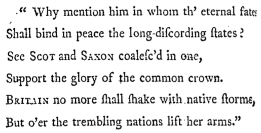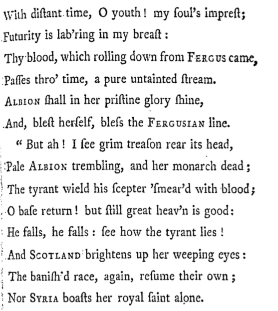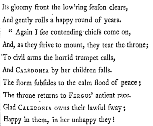 Perhaps the most interesting part of the poem is its prophecy in Canto V. Here, Alpin has been sent to a hermit, who predicts the future (which, for us and contemporary eighteenth-century readers is the past):