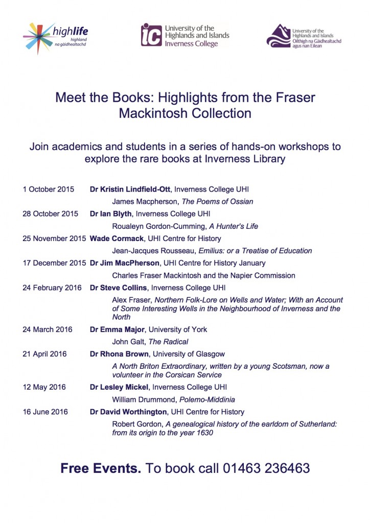 ‘Meet the Books’ has monthly workshops in Inverness Library. This page gives details about speakers, dates and times for those workshops.