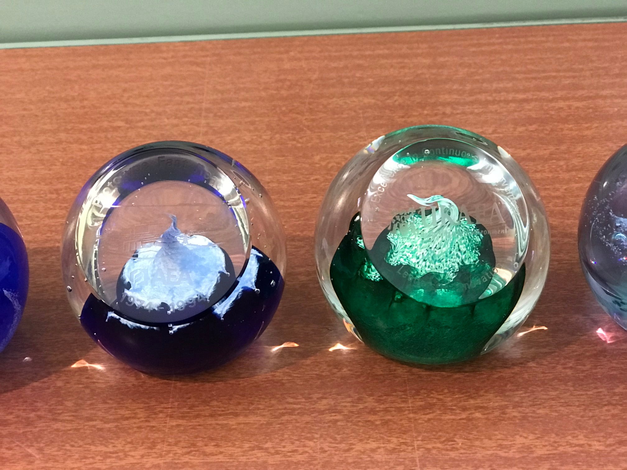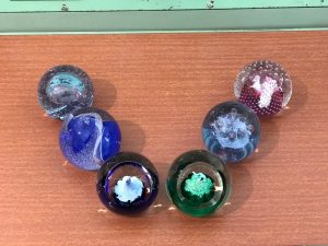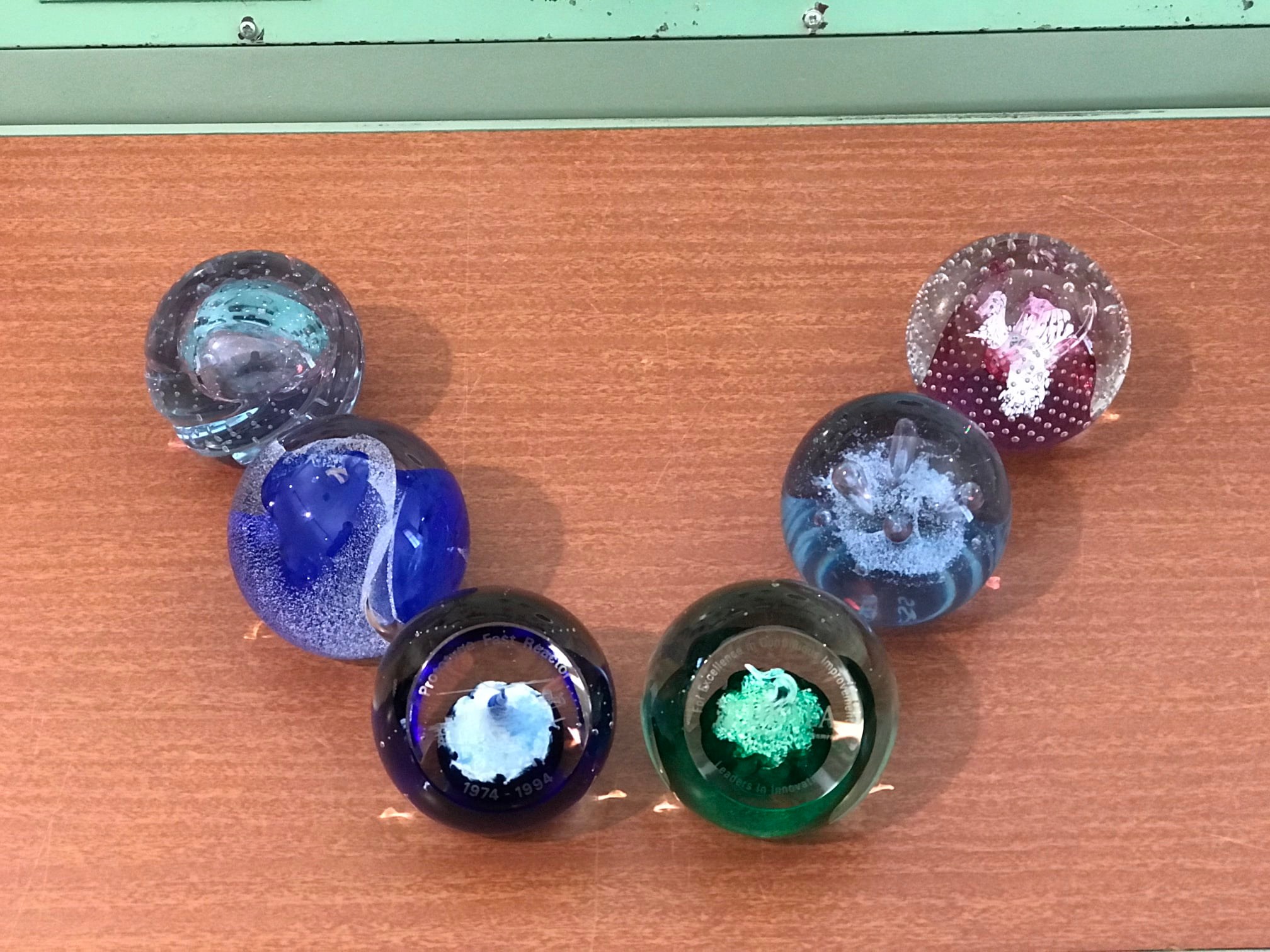 Six beautiful glass paperweights produced in Wick by Caithness Glass. One of them is from a line of paperweights specifically designed to commemorate the shutdown of the Prototype Fast Reactor at Dounreay in 1994. Another is dedicated to the UKAEA, the United Kingdom Atomic Energy Authority.