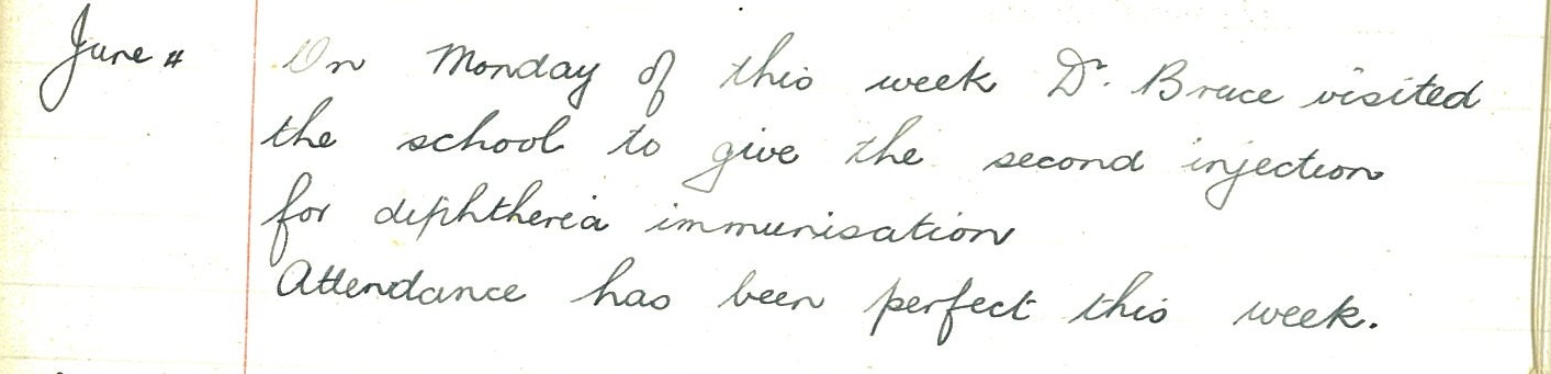 Back on 7 May the children of Ackergill School had received their first diphtheria shots. Now as the school log book records, it was time for their second. “On Monday of this week Dr Bruce visited the school to give the second injection for diphtheria immunisation.”