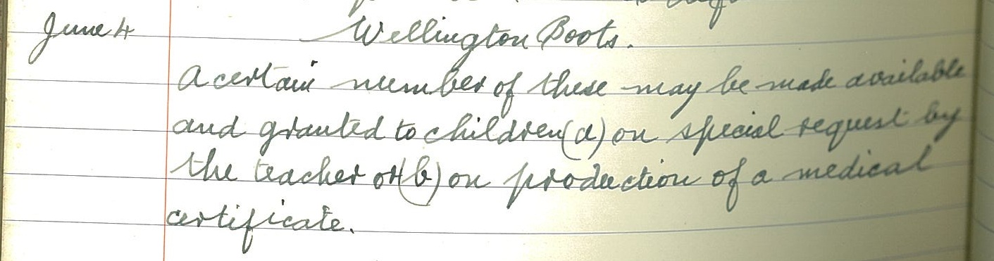 As several teachers had noted in their log books, many children in Caithness did not have adequate shoes to wear, and the shortage of rubber caused by the war only made things worse. Some American charities even arranged for shipments of rubber boots to be sent specifically for British children. On 4 June the Head Teacher of Gillock School noted in the log book: “Wellington Boots. A certain number of these may be made available and granted to children (a) on special request by the teacher and (b) on production of a medical certificate.”