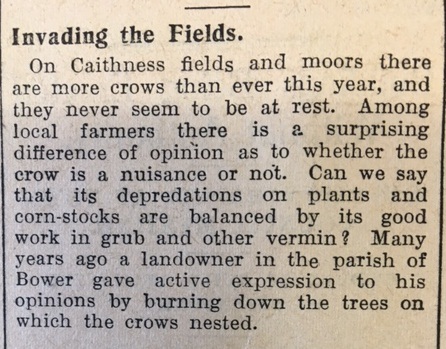 ‘Norseman’ in the John O’Groat Journal this week reflected on the county’s crow population, which was more numerous than ever, and recounted a drastic remedy to the problem. “Among local farmers there is a surprising difference of opinion as to whether the crow is a nuisance or not… Many years ago a landowner in the parish of Bower gave active expression to his opinions by burning down the trees on which the crows nested.”