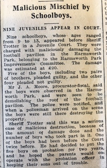 Finally this week the John O’Groat Journal reported a serious case of vandalism in Wick, when nine schoolboys aged between 9 and 13 were charged with “maliciously damaging the football pavilion in the Harmsworth Park… The boys were observed in the Harmsworth Park, and were seen to be demolishing the roof of the football pavilion. The police were notified, and when a policeman arrived on the scene the boys were still there destroying the property.” Five of the boys pleaded guilty and were put on probation.