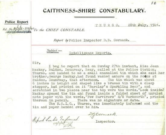The most poignant discovery this week was that of a “small enamelled tin” which George Mackay found washed ashore on the rocks at Buldoo, Dounreay on 28 July. “The tin which was about 6 inches in height and shaped like a brasso tin with a clasp stopper, had printed on it “Barclay’s Sparkling Beer”, and scratched in two places near the top were the words, “Look inside”. Mackay opened the tin and found inside a folded sheet of unruled note paper with the words, “Few Survivors. S/S Warkworh” printed thereon in pencil.”