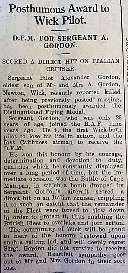The John O’Groat Journal reported this week the sad news of the first Wick-born pilot to lose his life in the war, Sergeant Pilot Alexander Gordon of Newton, Wick. Sergeant Gordon was also the first Caithness airman to receive the Distinguished Flying Medal, received posthumously for his action in the Battle of Cape Matapan, a naval engagement between the Royal Navy and the Italian fleet off the coast of Greece back in March 1941