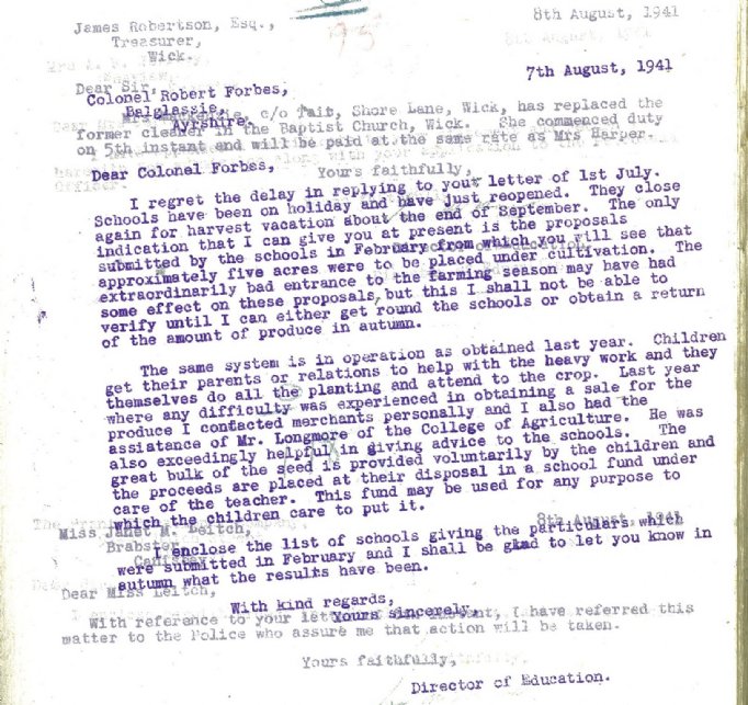 The same Director of Education set out in a letter how the schools were responding to the Dig for Victory campaign of growing crops on school grounds. Some five acres had been placed under cultivation. “Children get their parents or relations to help with the heavy work and they themselves do all the planting and attend to the crop… The great bulk of the seed is provided voluntarily by the children and the proceeds are placed at their disposal in a school fund under care of the teacher.”