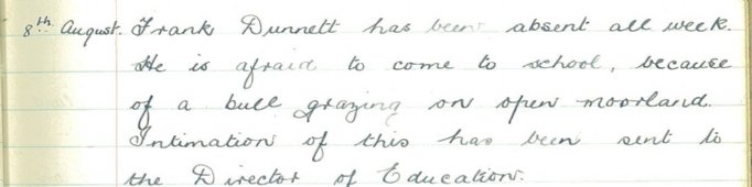 Not all pupils found it an easy matter to return. The Brabster School log book records: “Frank Dunnett has been absent all week. He is afraid to come to school, because of a bull grazing on open moorland. Intimation of this has been sent to the Director of Education.”