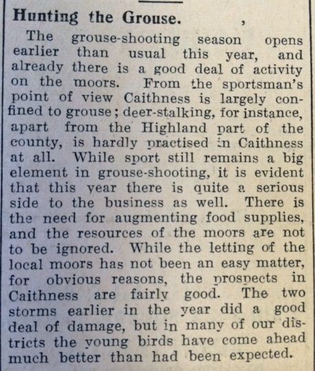 Finally this week, the John O’Groat Journal reported the start of the grouse-shooting season: “and already there is a good deal of activity on the moors. From the sportsman’s point of view Caithness is largely confined to grouse; deer-stalking, for instance, apart from the Highland part of the county, is hardly practiced in Caithness at all… The two storms earlier in the year did a good deal of damage, but in many of our districts the young birds have come ahead much better than expected.”