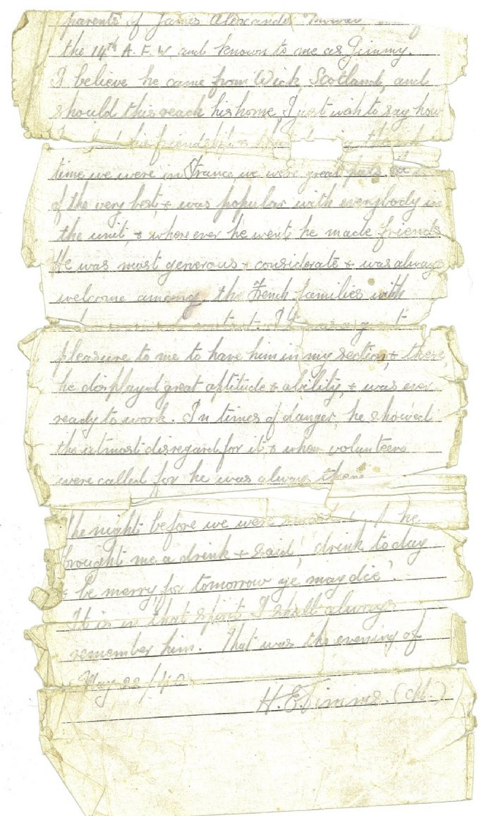 Week 107 20-sep-p344-5-john-mowat-letter-expressing-lossJames’s corporal, H.E.T. Timms, who was now in a German prisoner of war camp, wrote to the family expressing his sympathy for their loss: Jimmy, as he called him, “was one of the best and popular with everyone in the Unit and wherever he went he made friends… The night before we were smashed up he bought me a drink saying Drink and be merry, tomorrow we may die.” It is in this spirit that I shall remember him.”