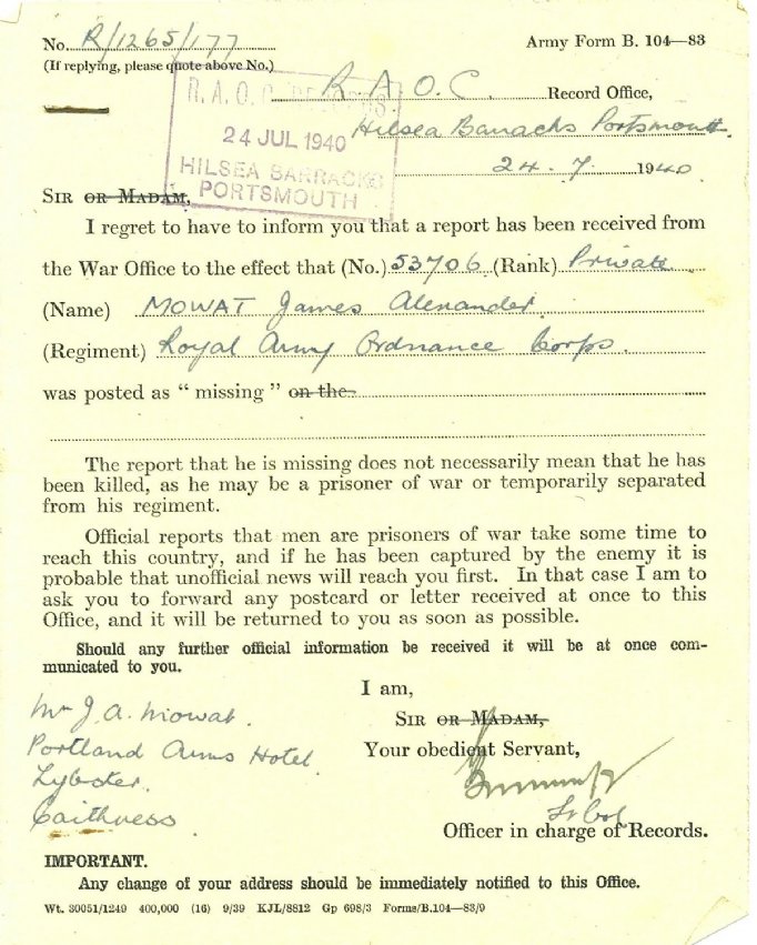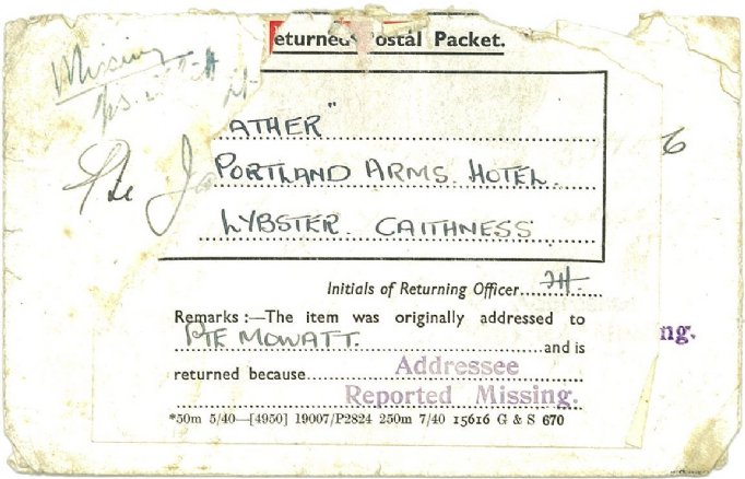 Week 107 20-sep-p344-6-john-mowat-missing-envelopeIn January 1940 his unit was posted to northern France, but in the confusion of fighting when Germany invaded in May, and the retreat which led to the evacuation at Dunkirk, all trace of him was lost. In early June his father sent a letter hoping to reach him but the letter was sent back marked “addressee posted missing”.