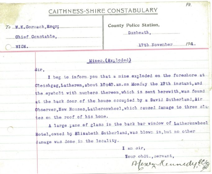 am. The Dunbeath police constable forwarded an eyebolt which was “found at the back door of the house occupied by David Sutherland, Air Observer, New Houses, Latheronwheel, which caused damage to three slates on the roof… A large pane of glass in the back bar window of Latheronwheel Hotel, owned by Elizabeth Sutherland, was blown in, but no other damage was done in the locality.”