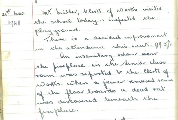 Back in Caithness, Bilbster School was experiencing a particularly unsavoury problem on 21 November: “An insanitary odour near the fireplace in the senior class room was reported to the Clerk of Works. When a joiner removed some of the floor boards a dead rat was discovered beneath the fireplace.”