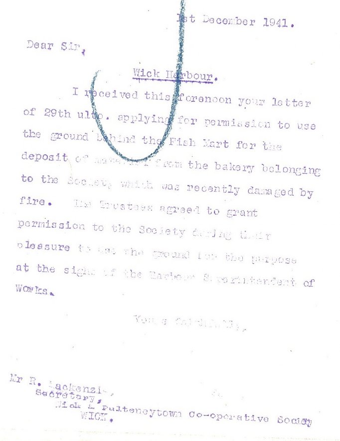 Following the recent damage to the Cooperative Society stores, the Society had written to the Wick Harbour Trust “for permission to use the ground behind the Fish Mart for the deposit of material from the bakery belonging to the Society, which was recently damaged by fire”. The Secretary of the Harbour Trust now replied, agreeing “to use the ground for the purpose at the sight of the Harbour Superintendent of Works.”