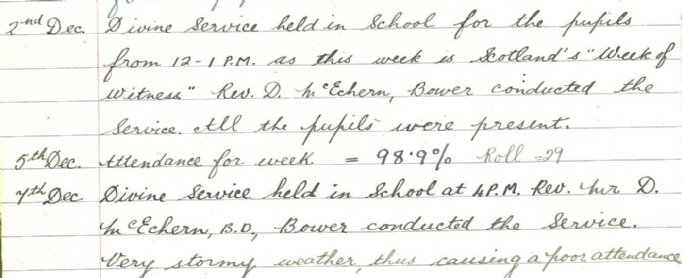 teacher for Stemster School in Bower wrote in the log book on 2 December: “Divine service held in school for the pupils from 12-1 P.M. as this week is Scotland’s “Week of Witness”. Rev. D. McEchern, Bower, conducted the service. All the pupils were present.” Another service was held in the school on Sunday 7 December, but this time there was “very stormy weather, thus causing a poor attendance.”