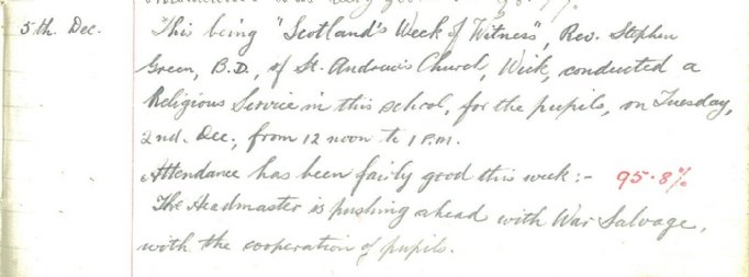 Killimster School also held a service for all pupils on 2 December, this time conducted by Rev. Stephen Green of St Andrew’s Church in Wick. The county’s salvage drive was underway and the School Log Book entry for 5 December adds: “The Headmaster is pushing ahead with War Salvage, with the cooperation of pupils.”