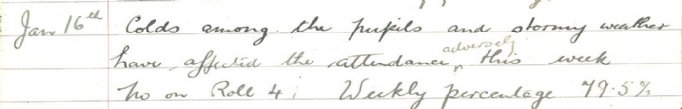 In Caithness, the dark and stormy weather, together with seasonal colds, was having an impact on the new school term. The Head Teacher of Crossroads School in Dunnet recorded in the log book on 16 January, “Colds among the pupils and stormy weather have affected the attendance adversely this week. No. on roll – 4.”