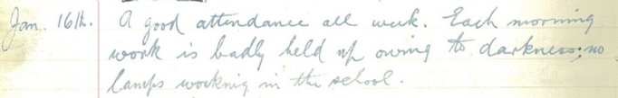 But Killimster School in Wick faced a different problem. On the same day their log book notes, “A good attendance all week. Each morning work is badly held up owing to darkness; no lamps working in the school.”