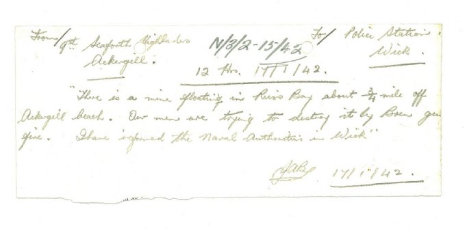 Meanwhile the danger of mines washing ashore in Caithness continued, and these were sometimes dealt with by direct action. On 17 January the 9th Seaforth Highlanders at Ackergill sent the following message to the police at Wick: “There is a mine floating in Reiss Bay about ¾ mile off Ackergill beach. Our men are trying to destroy it by Bren gun fire. Have informed the Naval Authorities in Wick.”
