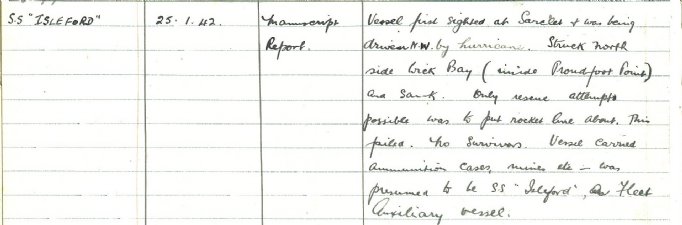 recorded the incident in the log: “Vessel proceeding in convoy through Pentland Firth when all shore lights were suddenly extinguished. A gale was blowing at time & a strong ebb tide was flowing. The “Empire Parsons” was in ballast & went aground at Scarton Point on S.E. point of Stroma Island. Crew were taken off by Breeches Buoy. Vessel badly damaged – engine room flooded.”