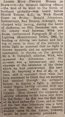 Week 128 13-Feb-JOG-Lights-Precede-HorseFinally this week, the John O’Groat Journal reported “an unusual lighting offence, the first of its kind in the North of Scotland probably.” Donald Johnstone, a farm servant from Ackergill, had been leading two horses along the road without a light (the blackout regulations specified that no light should be thrown upwards, or onto the ground); as a result, “a military motor wagon [had] collided with one of the horses, which was seriously injured.” Because it was a first offence, and as Johnstone was an employee, the fine was limited to £1.”