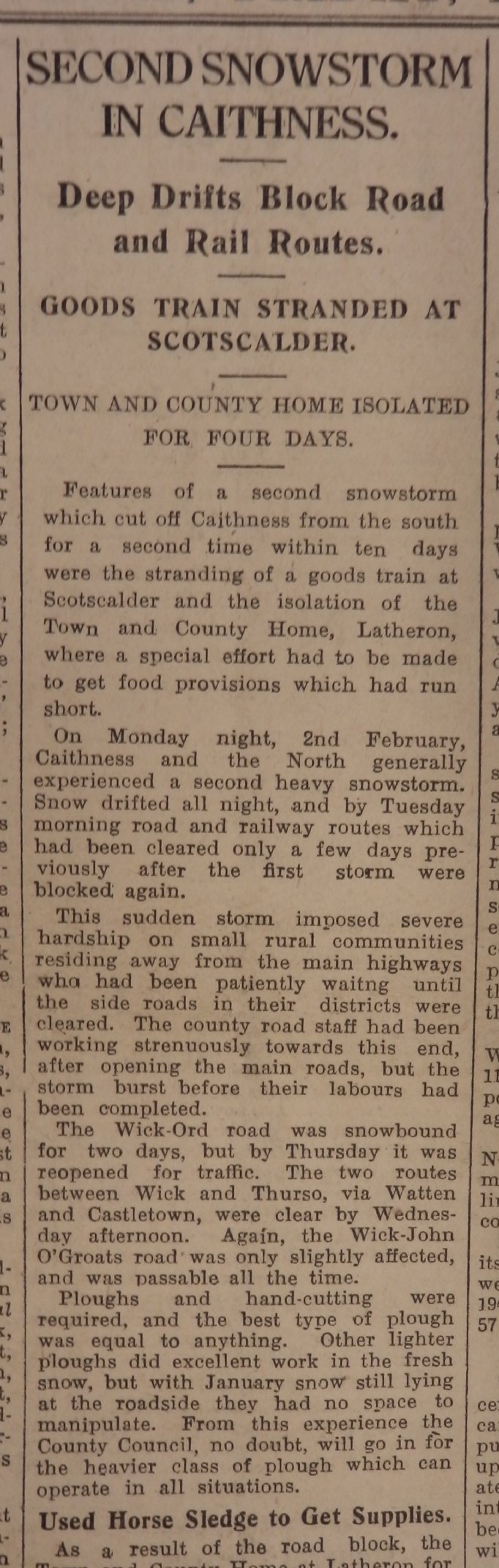 Week 128 13-feb-jog-second-snowdrift-2In Caithness, the John O’Groat Journal reported the impact of the recent snowstorms on the county. “Features of a second snowstorm which cut off Caithness from the south for a second time within ten days were the stranding of a goods train at Scotscalder and the isolation of the Town and County Home, Latheron, where a special effort had to be made to get food provisions which had run short.”