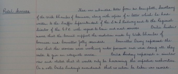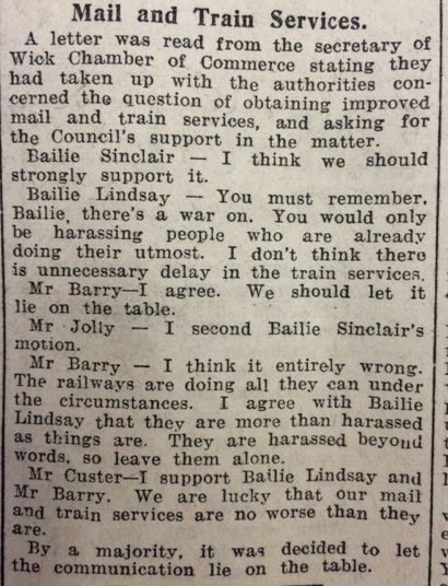 Week 128 thurso-burgh-mins-postal-servicesThurso Burgh debated the question of mail and train services to the county, and the disruption caused by the war. Wick Chamber of Commerce had written to ask for support in lodging a complaint. But the members Week 128 13-feb-jog-thurso-burgh-trainsdisagreed, as reported in the John O’Groat Journal. Bailie Lindsay said, “You must remember … there’s a war on. You would only be harassing people who are already doing their utmost. I don’t think there is an unnecessary delay in the train services.” Mr Barry agreed: “They are harassed beyond words, so leave them alone.” As the minute records, “On a vote Bailie Lindsay’s amendment that no action be taken was carried.”