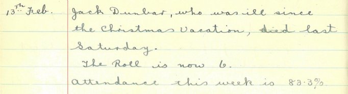 Week 128 john-dunbar-death-certificateThe young were particularly vulnerable at this time of year. A deceptively plain entry in theWeek 128 13-feb-latheron-brickigoe-school-ill-pupil-dies Latheron Brickigoe School log book for 13 February reads: “Jack Dunbar, who was ill since the Christmas vacation, died last Saturday. The roll is now 6.” A check on the Scotlands People website reveals that he died of acute leukemia; he was just five years old.