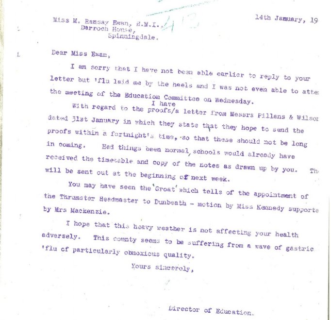 Winter illnesses were sweeping through the county. A letter from the Director of Education on 14 February to a Miss Ewan ends, “I hope that this heavy weather is not affecting your health adversely. This county seems to be suffering from a wave of gastric ‘flu of particularly obnoxious quality.”