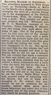 Finally this week, the same paper reported the case of some less fortunate boys who appeared in Wick Burgh Court accused of puncturing the tyres of a tricycle belonging to the Pavilion Picture-house. Two young boys aged about nine years were produced as witnesses: “One of the young boys said he had seen one of the accused cutting the tricycle tyres with a knife. He said the accused made him tell lies before, and they would strike him after the Court for telling the truth. They had threatened to do so.” In his rather