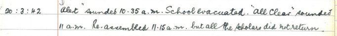 Pulteneytown Academy School in Wick, however, was still troubled by persistent air raids, and it seems that some pupils saw an opportunity for an extra half day holiday. The Head Teacher noted on 20 March: “’Alert’ sounded 10.35 a.m. School evacuated. ‘All clear’ sounded 11 a.m. re-assembled 11.15 a.m. but all the scholars did not return.”