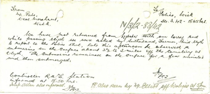 On 24 March Mr Pate, coal merchant of Wick, notified the police: “We have just returned from Lybster with our lorry and while passing Clyth we were asked by Sutherland, farmer, Mid-Clyth to report to the Police that late this afternoon he observed a submarine on the surface about 2½ to 3 miles off the cemetery at Clyth. The submarine remained on the surface for a few minutes and then submerged.” A postscript adds: “Also seen by Mr Elliot off Waligoe [sic] at 5pm.”