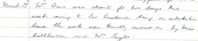 On 27 March the Greenland School log book contains the following note: “Mrs Bews was absent for two days this week owing to her husband being on embarkation leave the work was kindly carried on by Miss Cuthbertson and Mrs Taylor.”