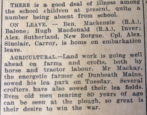 Week 134 27-mar-jog-dunbeath-district-newsAll over Caithness the sowing of oats was underway, as the John O’Groat Journal reported, with the ground being in a fairly good condition: In Dunbeath, “Mr Mackay, the energetic farmer of Dunbeath Mains, sowed his lea park on Tuesday. Several crofters have also sowed their lea fields. Even old men nearing 80 years of age can be seen at the plough, so great is their desire to win the war.”