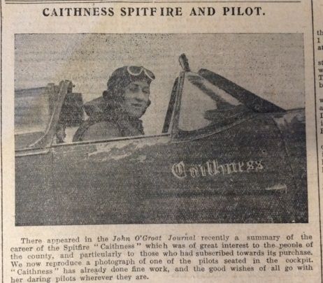 The John O’Groat Journal this week printed a photograph of the Spitfire “Caithness”, paid for by donations from the county, with one of the pilots seated in the cockpit. “’Caithness’ has already done fine work,” the paper added, “and the good wishes of all go with her daring pilots wherever they go.”