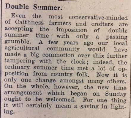 Week 136 10-apr-jog-double-summerThe clocks had just gone forward, heralding the start of double summer time. ‘Norseman’ in his column in the Groat observed that “even the most conservative-minded of Caithness farmers and crofters were accepting the imposition of double summer time with only passing grumble.” Double summer time had begun in 1940, when the clocks had not been put back an hour in the autumn; when the clocks next went forward in the following spring Britain was therefore two hours ahead of Greenwich Mean Time. As Norseman observed, “On the whole, however, the new time arrangement which began on Sunday ought to be welcomed. For one thing it will certainly mean a saving in lighting.”