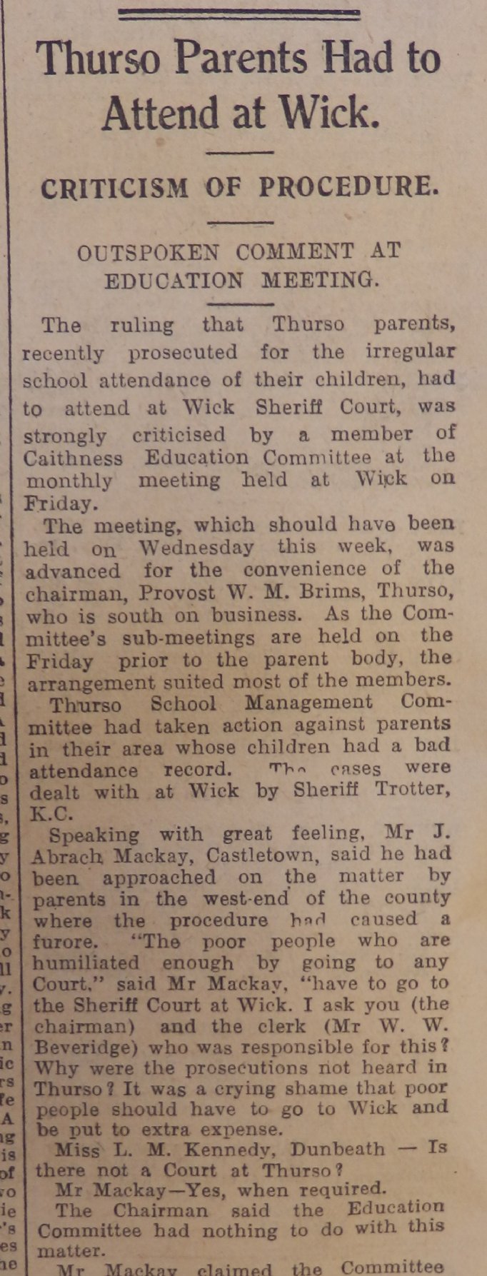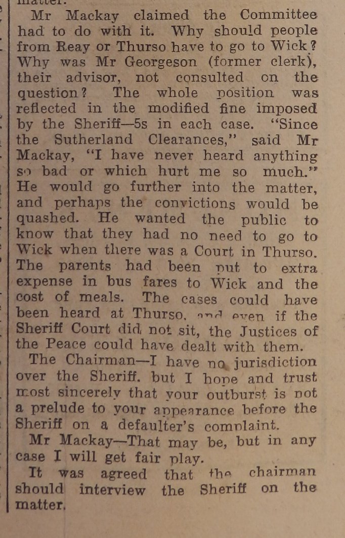 Week 136 10.04.1942-groat-thurso-parents-1Finally this week, the John O’Groat Journal reported a debate at the Education Committee Week 136 10.04.1942-groat-thurso-parents-2over the summoning to Wick Sheriff Court of parents of children from Thurso who had not attended school regularly. One member declared, “The poor people who are humiliated enough by going to any Court have to go to the Sherriff Court at Wick.” He added with pardonable warmth: “Since the Sutherland Clearances, I have never heard anything so bad or which hurt me so much.” The Sheriff seems to have treated the parents leniently, imposing a fine of five shillings each.