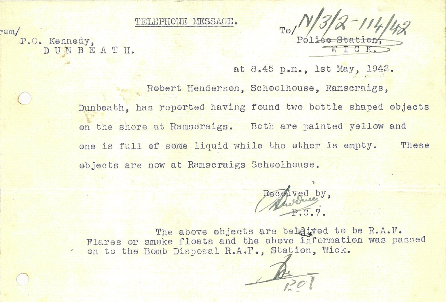 Mines were still a constant hazard along the coast of Caithness. Police Constable Alexander Gunn at Mey reported on 2 May, “I beg to report that on Wednesday afternoon, 29 April 1942, Alexander C. Ross, SXHF/47/1, crofter and presently coastwatcher, “Rosebank”, Freswick, Canisbay, found a mine washed ashore in a goe near Berryhill, Auckengill. The mine is a British one… It was taken charge of by the mine disposal squad on the following night.”