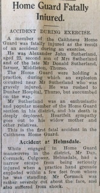 Finally this week, the risks of active service even in the Home Guard were brought home when the John O’Groat Journal reported the death of Alexander John Sutherland of Middleton, Thurso, who was killed by an explosion