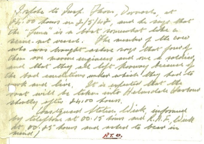 anchored ½ mile off Helmsdale. Crew consists of five Germans who say they came away from Bergen. Armed guard aboard. The boat is being taken into Helmsdale on the tide at 11pm tonight.” Another note adds, “The member of the crew who was brought ashore says that four of them are marine engineers and one a soldier and that they all left Norway because of the bad conditions under which they had to work and live”.