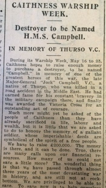 Finally this week, after it success in raising funds for a “Caithness” Spitfire, the county was gearing up for Warship Week later in the month. The target was to raise £200,000 “to purchase a destroyer, to be named ‘Campbell’ in memory of one of the greatest heroes of this war, the late Major-General “Jock” Campbell, VC who was killed in a road accident in the Middle East.” As the advertisement said, “Invest every Pound and Penny you have in Government Stocks, etc., during the Warship Week to ensure the safe launching of H.M.S. Campbell.”