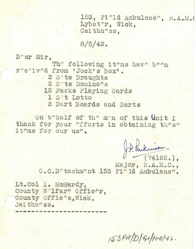 The Armed Services collected games and leisure equipment so their members could entertain themselves, known as “Jock’s Box”. An idea of what they contained is shown in a letter from the Royal Army Medical Corps stationed at Lybster, acknowledging receipt of 2 sets draughts; 2 sets dominoes; 12 packs playing cards; 1 set Lotto; 2 dart boards and darts.