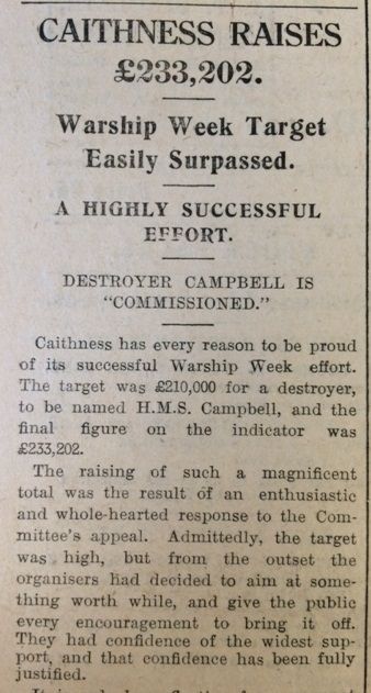 Last week Caithness had celebrated Warship Week, a series of events across the county to raise funds for a new destroyer to be named after the late Major Jock Campbell of Thurso. Now the John O’Groat Journal reported, “Caithness has every reason to be proud of its successful Warship Week effort. The target was £210,000 for a destroyer, to be named H.M.S. Campbell, and the final figure on the indicator was £233,202.” The headline read, “Destroyer Campbell is Commissioned.”