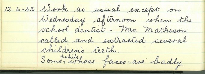 Back in Caithness the school dentist was still making her painful rounds. On 12 June she reached Auckengill School, as the Head Teacher recorded in the log book: “Work as usual except on Wednesday afternoon when the school dentist, Mrs Matheson, called and