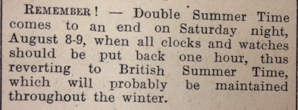 The rather confusing timekeeping of the war continued this week as the John O’Groat Journal reported that Double Summer Time was coming to an end on Saturday night, “when all clocks and watches should be put back one hour, thus reverting to British Summer Time, which probably be maintained throughout the winter.”